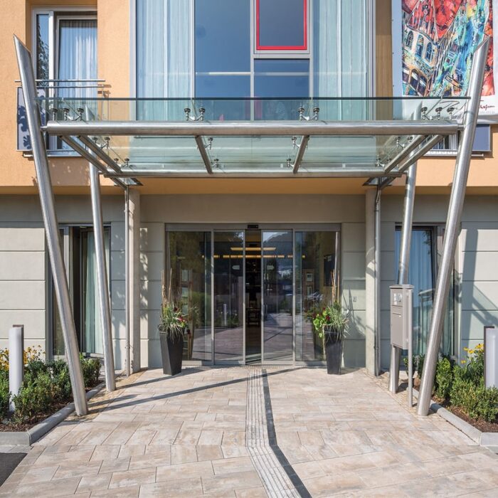 The glazing is made of 10 mm safety glass and protected by slender fine-frame profiles.