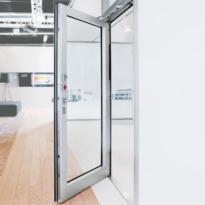 The dormakaba M-SVP 2000 DCW® ensures that the door can be immediately opened by the lever handle for egress in the emergency direction.