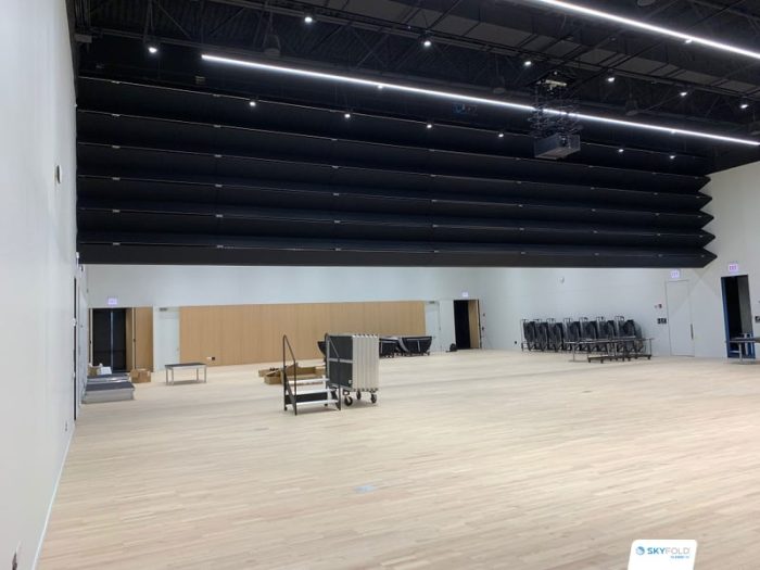 Skyfold is a vertical movable wall system that retracts to the ceiling. It is space-saving, requires no guide or track rails and offers acoustic insulation up to Rw 59 dB. This elegant and robust folding wall system enables rapid and fully automatic operation at the press of a button.