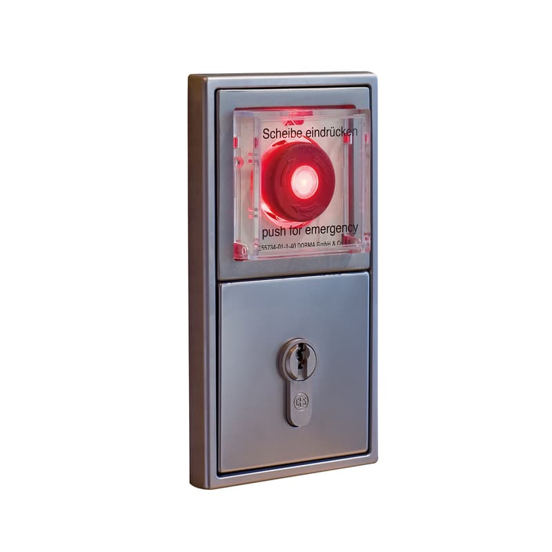 Emergency stop switch to disconnect TMS systems, for connections to the RZ TMS 2 or TL-S TMS 2 control board through the DCW® system bus. With visual and acoustic alarms and protection against tampering. The emergency stop switch cover consists of shatterproof safety glass.