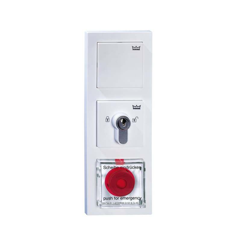 The escape route system is perfectly incorporated in the overall design of the building’s electronic components. If the 24 V power supply is provided on site, only two device boxes are required, as the control unit and the emergency pushbutton are a single unit. The system can also be used outdoors in conjunction with suitable cover frames (TX 44).