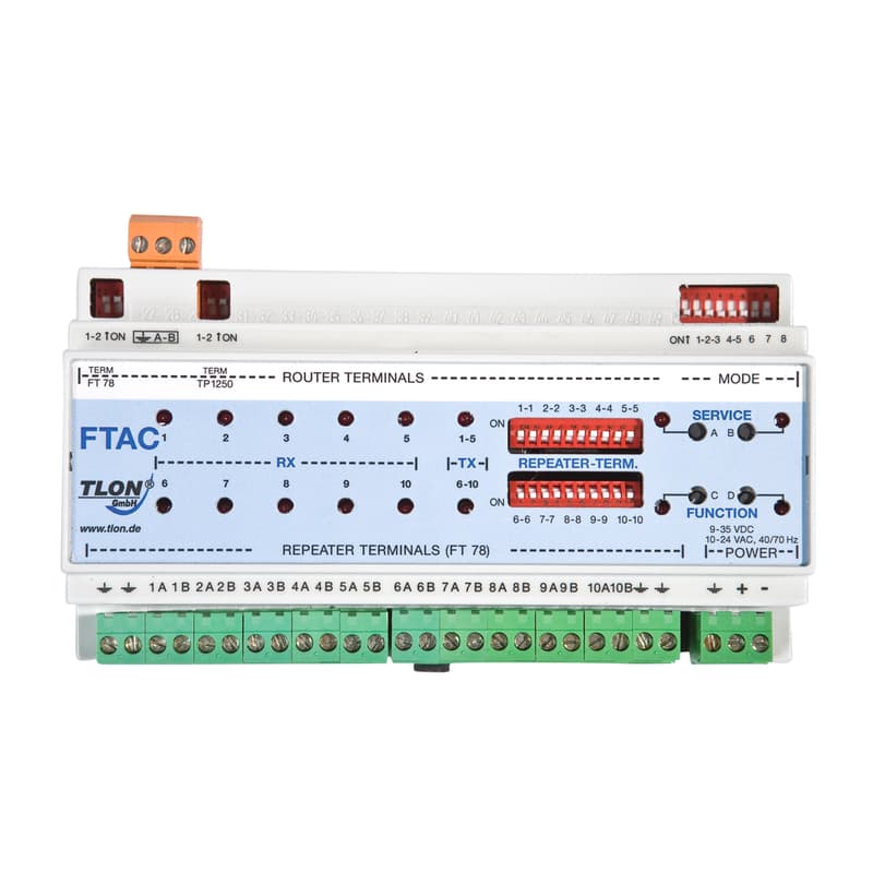 The LON 10-channel multi-port repeater is required for expansion of the LON circuit for an additional 64 nodes per port and bus lengths > 900 m. It is also possible to use the multi-port repeater as LON router.