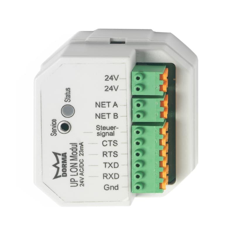 The compact TMS LON UP module can be installed in device boxes and is suitable for connecting the TMS Comfort flush-mounted escape route security system and the automatic or sliding door drives ED 100/250 and ES 200 to LON networks.