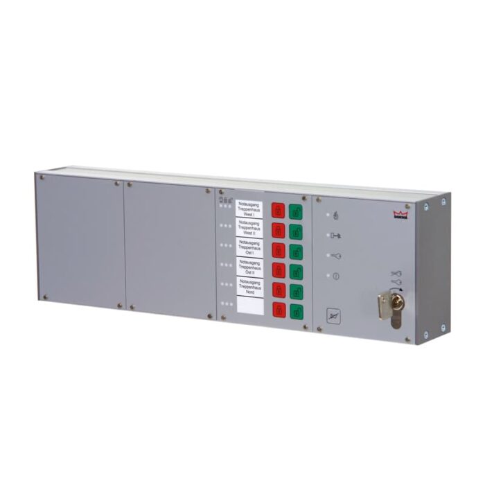 Escape route doors are monitored and controlled centrally with TMS panel systems. Specific doors or door groups can be operated from remote locations, which is a good option particularly for interlock applications or as access solutions for security areas. This system is frequently used in forensic or psychiatric areas in which individual escape route doors do not have an individual emergency stop switch; instead this switch is installed centrally in an area that is constantly occupied. The panel(s) can be networked via LON, LAN or a conventional RS485 bus depending on the requirements.