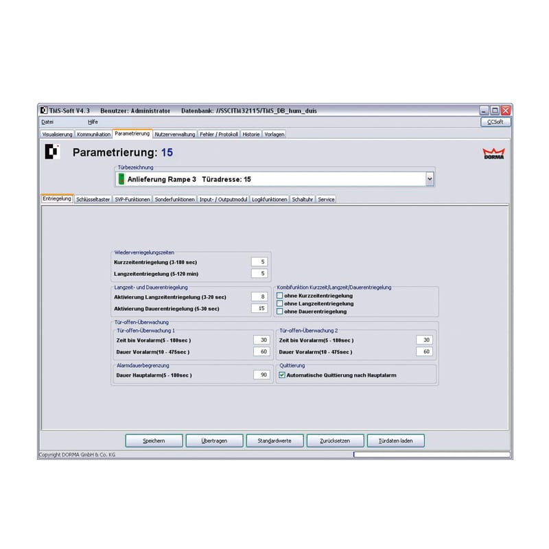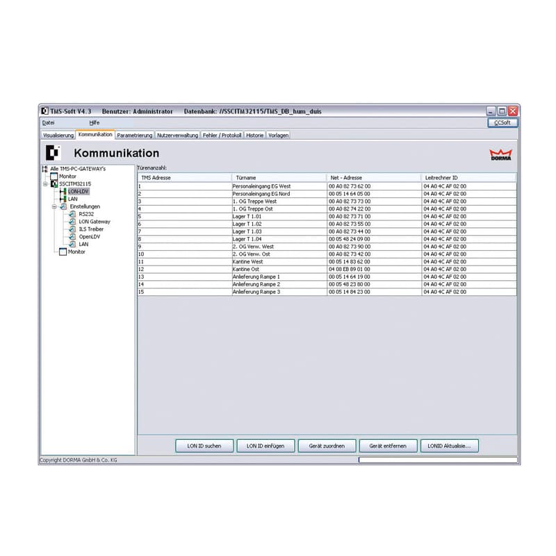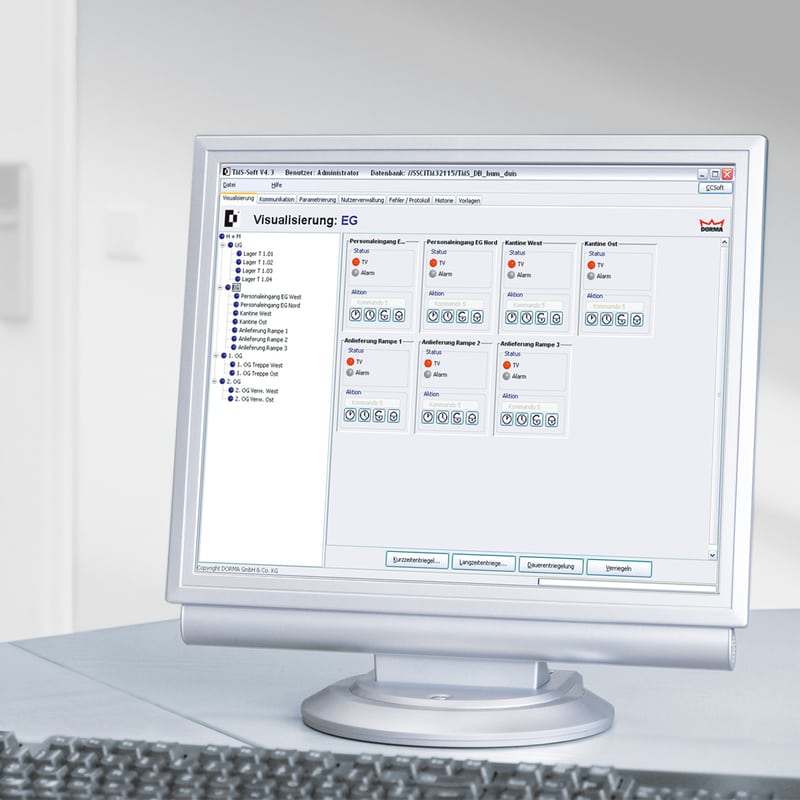 The universal software for convenient control, management, monitoring and documentation of individual doors and groups of doors as well as all door functions of TMS emergency exit control systems. It is possible to connect an unlimited number of doors via LAN or LON network. The system also allows real-time management of further dormakaba components like automatic and swing door operators, SVP/M-SVP locks, and access control readers.